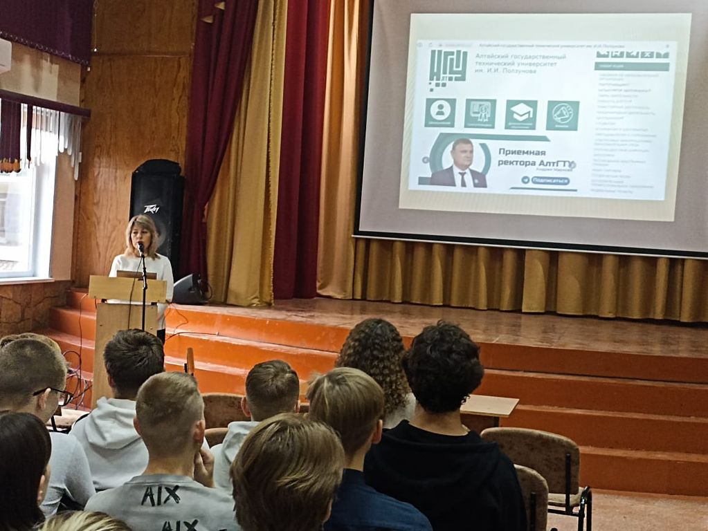 На встречу пришли учащиеся 10 и 11 классов. Преподаватели нашего вуза представили школьникам информацию о направлениях подготовки, реализуемых в ИнБиоХим, и условиях поступления в АлтГТУ.