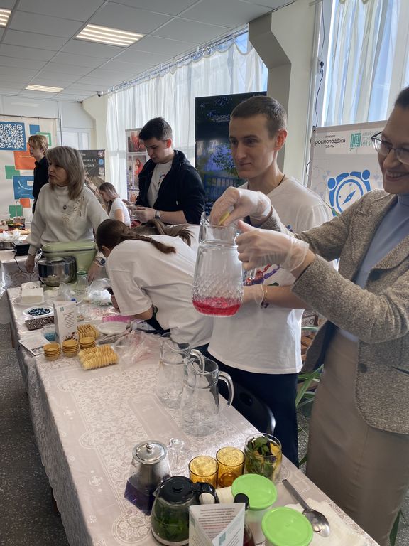 Дикалова Е.С. учила школьников готовить безалкогольные напитки с природными антиоксидантами. Студенты выпускной группы этого профиля – Зайцев Никита и Шлыкова София (ПРС-22) рассказывали школьникам об особенностях работы технолога пищевых производств, о значении растительного сырья и продуктов его переработки в нашем питании. Каждый желающий смог попробовать на вкус свежеприготовленные напитки на плодово-ягодной основе и научиться их готовить самостоятельно.
