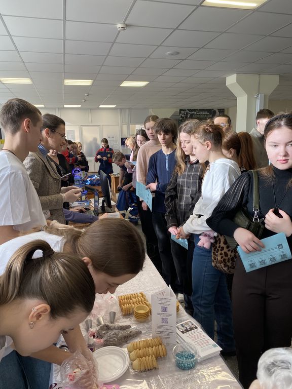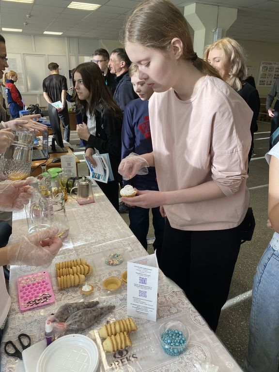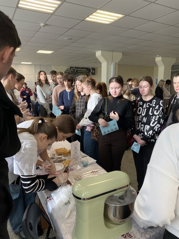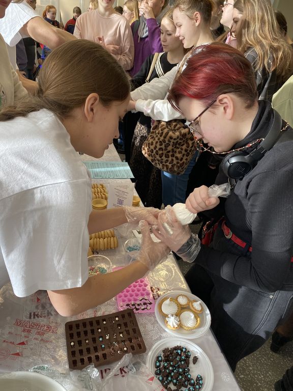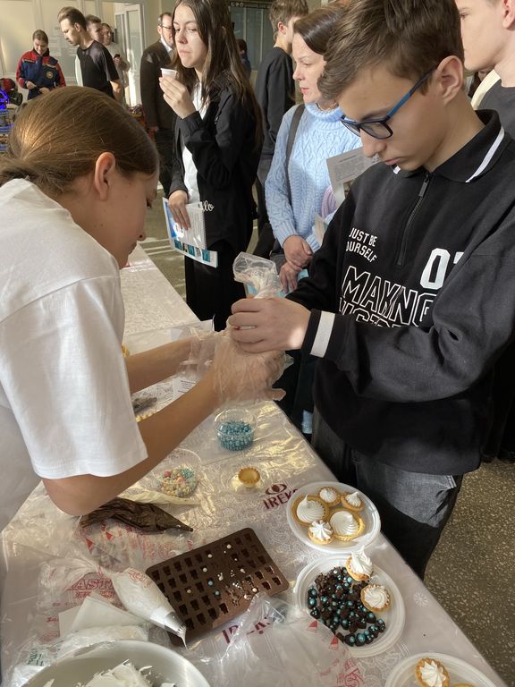 Конева С.И. и Кузьмина С.С. организовали и провели мастер-класс по декорированию мучных кондитерских изделий. Им активно ассистировали студенты – Шлыкова София (ПРС-22), АбрамоваВиктория и Пономарев Никита (8ПРС-51), отвечающие за оперативное приготовление белкового крема и обучение школьников работе со специальным технологическим оборудованием и инструментарием – миксером, кондитерскими шприцами и насадками. Особое значение уделялось санитарно-гигиеническим условиям организации мастер-класса: каждому участнику были выданы собственные инструменты и одноразовые перчатки.Под руководством студентов и преподавателей ребята учились отсаживать кремы и придавать им классическую или оригинальную форму, декорировали изделия специальными кондитерскими посыпками, а потом с нескрываемым удовольствием дегустировали результаты своих трудов.