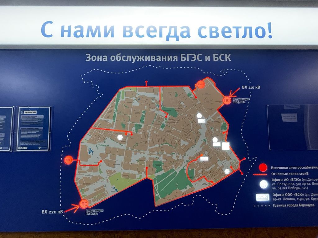 На нем изображена та часть города, электроснабжение которой осуществляют Барнаульская сетевая компания и Барнаульская горэлектросеть.